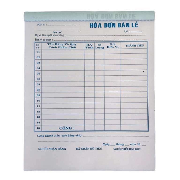 - Loại: Sổ hóa đơn bán lẻ 2 liên, 3 liên